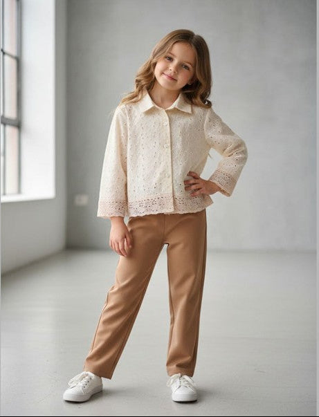 HAKOBA SHIRT features fine HAKOBA embroidery on soft, breathable fabric, giving your little girl a stylish yet comfortable look. Its elegant neutral tone and relaxed fit make it perfect for parties, outings, and everyday wear.
