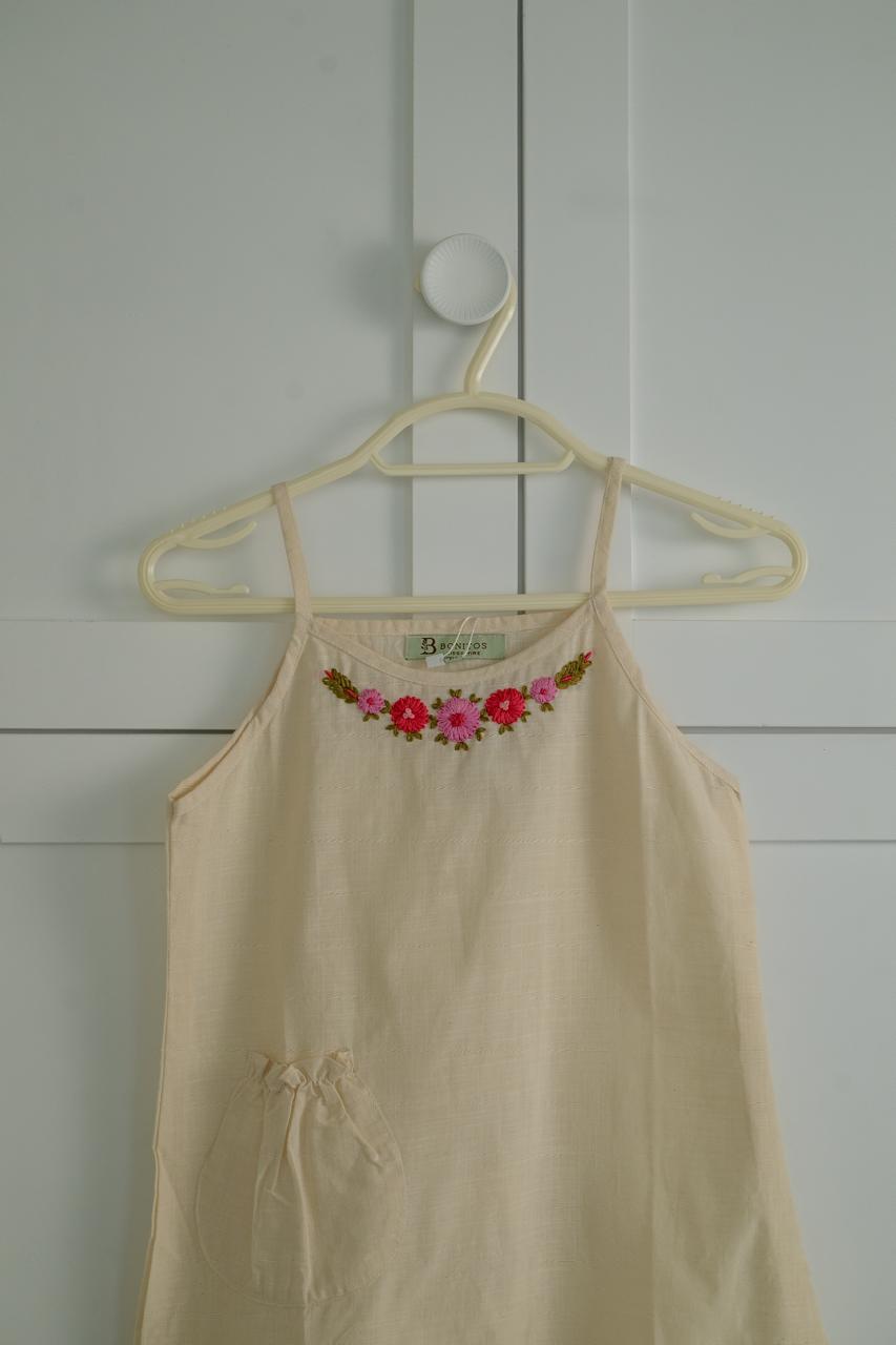 This elegant off white frock is crafted from soft, breathable cotton and features delicate floral embroidery along the neckline. With simple straps, a cute side pocket with a bow, and a ruffled hem, it is perfect for outings, everyday wear, and warm-weather occasions.